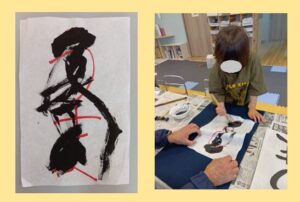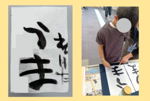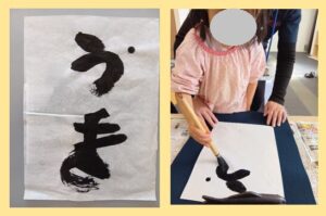 今回、子ども達は書道が初めての体験という子も多く、墨の匂い、筆の柔らかな感触、真っ白な紙に向かう静かな緊張感など五感をフルに使って、文字を書いたり、線を引くことに挑戦しました。大人はつい形を教えたくなりますが、今回は「その子が書きたいもの」を大切にしました。型にはめるのではなく、一人ひとりの個性が光る作品を作り出せるよう、温かく見守り、全力で応援していきたいと思います。