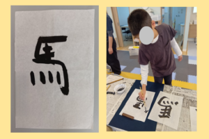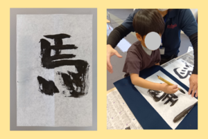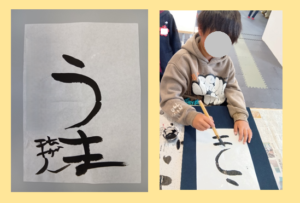 たっぷり墨をつけて、半紙いっぱいに描かれた「うま」の文字。作品を手にカメラの前に立つ子供たちの顔はみな誇らしげでした。今回指導員も参加させてもらい、ドキドキワクワクを楽しみました。パソコンで簡単な綺麗な字が作れる時代ですが、気持ちのこもった自分だけの字はやはり素晴らしいです。